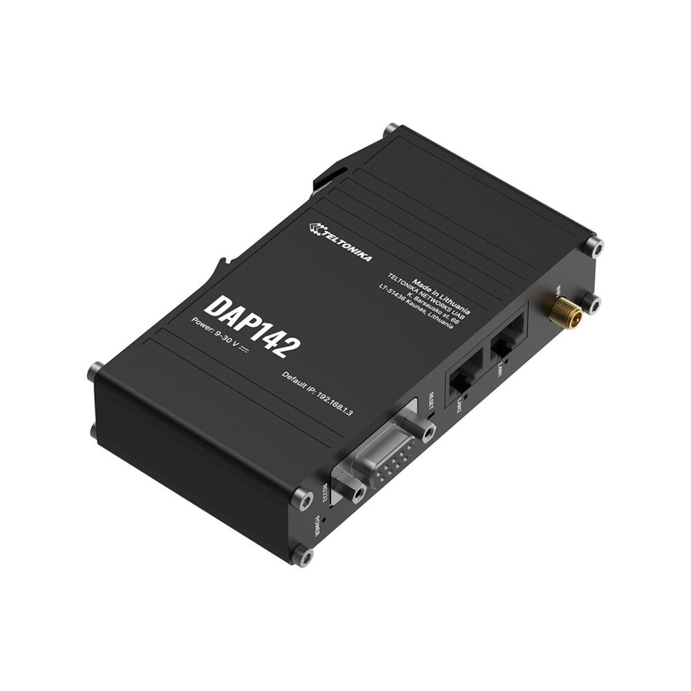 The Teltonika DAP142 is an access point designed for industrial applications requiring reliable wireless connectivity, robustness and flexibility. Compatible with the WiFi 4 (802.11b/g/n) standard, it supports Access Point, Client and Mesh (802.11s) modes with fast roaming, offering stable coverage and the ability to manage up to 50 simultaneous devices.