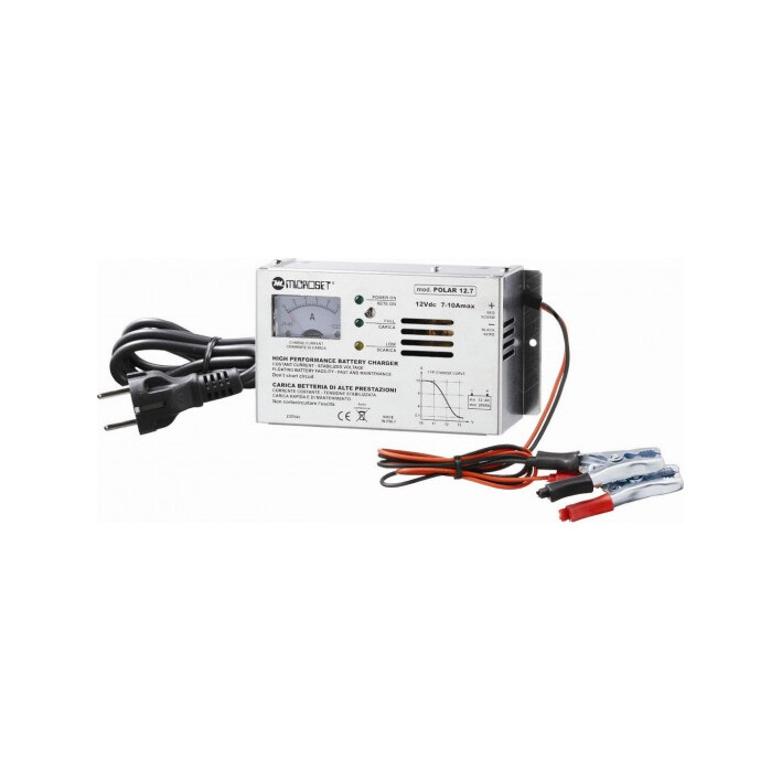 Il POLAR 12.7 di MICROSET è un caricabatteria automatico progettato per batterie da auto e applicazioni simili. Fornisce un'uscita a 12 V con corrente regolata tra 7 e 10 A, compatibile con batterie da 40 a 100 Ah. Grazie all'amperometro analogico integrato e all'indicatore di fine carica, consente un controllo immediato dello stato di ricarica. Il dispositivo è in grado di effettuare sia cariche rapide che di mantenimento, risultando versatile e sicuro per tutti i tipi di batterie. Compatto e robusto, rappresenta una soluzione ideale per uso professionale e privato.