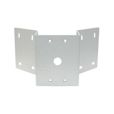 Supporto angolare in alluminio verniciato per montaggi su angoli esterni, compatibile con telecamere dome o bullet Avigilon tramite staffe pendenti standard. Include inserti femmina e fascette metalliche per pali da à˜152 a à˜508 mm.