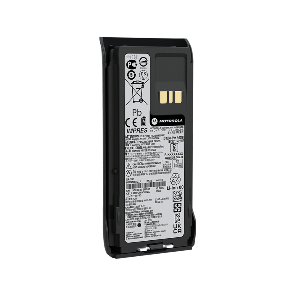 Batteria sottile LiIon da 2200 mAh con tecnologia IMPRES e certificazione IP68. Dotata di autocalibrazione che elimina la necessità di reconditioning manuale mensile, ideale per radio MOTOTRBO R7. Garantisce ricarica rapida e prestazioni affidabili, con gestione intelligente del ciclo di vita risparmiando tempo e risorse.