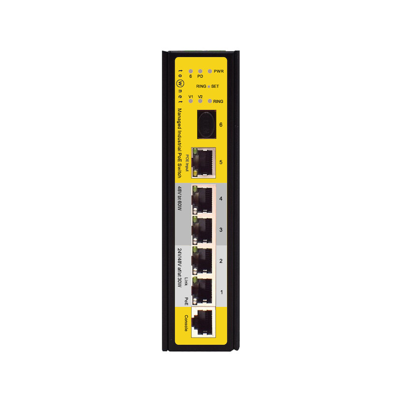 Lo switch PoE gestito TW SB5 POE di Townet è progettato per applicazioni industriali affidabili e ad alte prestazioni. Dispone di 5 porte Gigabit Ethernet RJ45 e 1 slot SFP per la connessione in fibra, con buffer fino a 4Mbit. Supporta trasmissioni video fino a 4K e fornisce alimentazione PoE sulle prime quattro porte: le prime due gestiscono PoE passivo a 24V o attivo a 48V (IEEE 802.3af/at) fino a 30W, le porte 3 e 4 arrivano fino a 60W con standard IEEE 802.3bt.