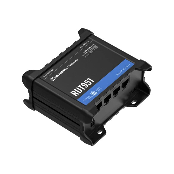Il RUT951 è un router cellulare industriale con connettività  4G LTE Cat 4 fino a 150 Mbps in download e 50 Mbps in upload, retrocompatibile con reti 3G/2G. Supporta dual SIM con switch automatico e include Wi-Fi 802.11b/g/n con hotspot fino a 100 client contemporanei.
