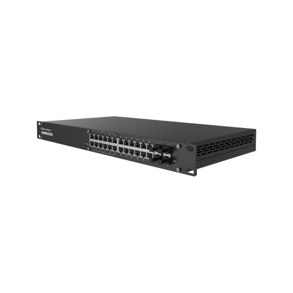 Il Teltonika SWM280 è uno switch managed multi-layer con architettura L2+ progettato per installazioni professionali e industriali in ambienti controllati. Offre 24 porte Ethernet 10/100/1000 Mbps auto MDI/MDIX e 4 slot SFP per uplink in fibra ottica, con una banda passante non-bloccante da 56 Gbps e capacità di inoltro pari a 83,33 Mpps.