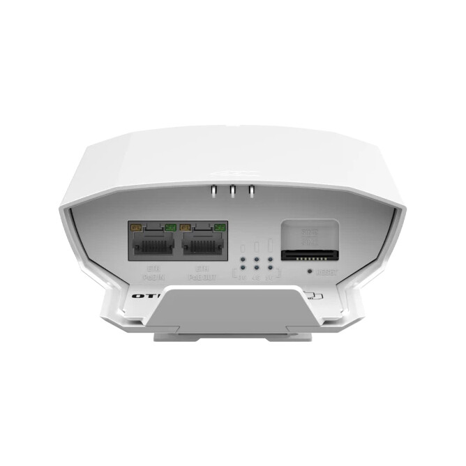 Dotato di un involucro resistente IP55 in plastica PC+ASA e staffa integrata per un facile montaggio su palo o parete. Dispone di due porte RJ45 Gigabit: una PoE-in (802.3af/at) per alimentazione tramite cavo Ethernet e una PoE-out (802.3af Alternative B) per alimentare dispositivi esterni fino a circa 15 W. L'alimentazione avviene da 42,5 a 57 VDC con protezioni contro inversione di polarità e sovratensioni.