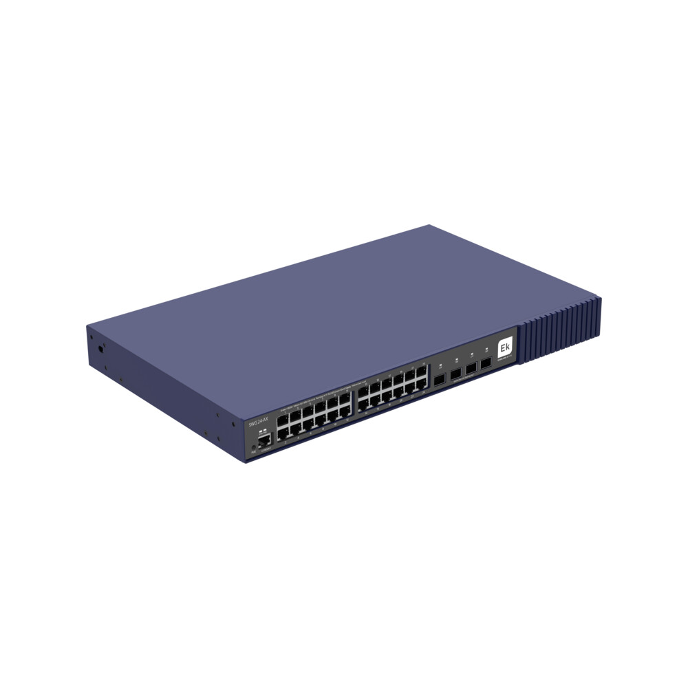 Lo switch gestito Layer 2+ SWG 24-AX di Ekselans è una soluzione professionale per reti Ethernet che richiedono flessibilità, potenza e controllo centralizzato. Dispone di 24 porte 10/100/1000 PoE/PoE+ e 4 porte SFP 1G per connessioni ad alta velocità. Con una potenza complessiva PoE di 370 W, è perfetto per alimentare access point, telecamere IP e altri dispositivi di rete.