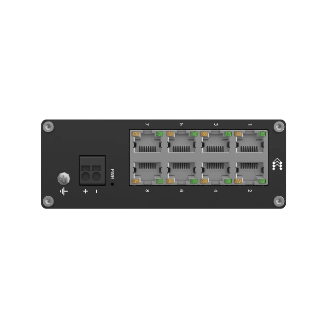 Switch Ethernet industriale unmanaged, plug-and-play con otto porte RJ45 10/100 Mbps. Design compatto e robusto con alloggiamento in alluminio anodizzato e supporto integrato per montaggio su guida DIN. Consumo energetico ultra-basso (0,5 W in idle, 1,5 W massimo), ideale per ambienti industriali che richiedono connettività semplice e affidabile.