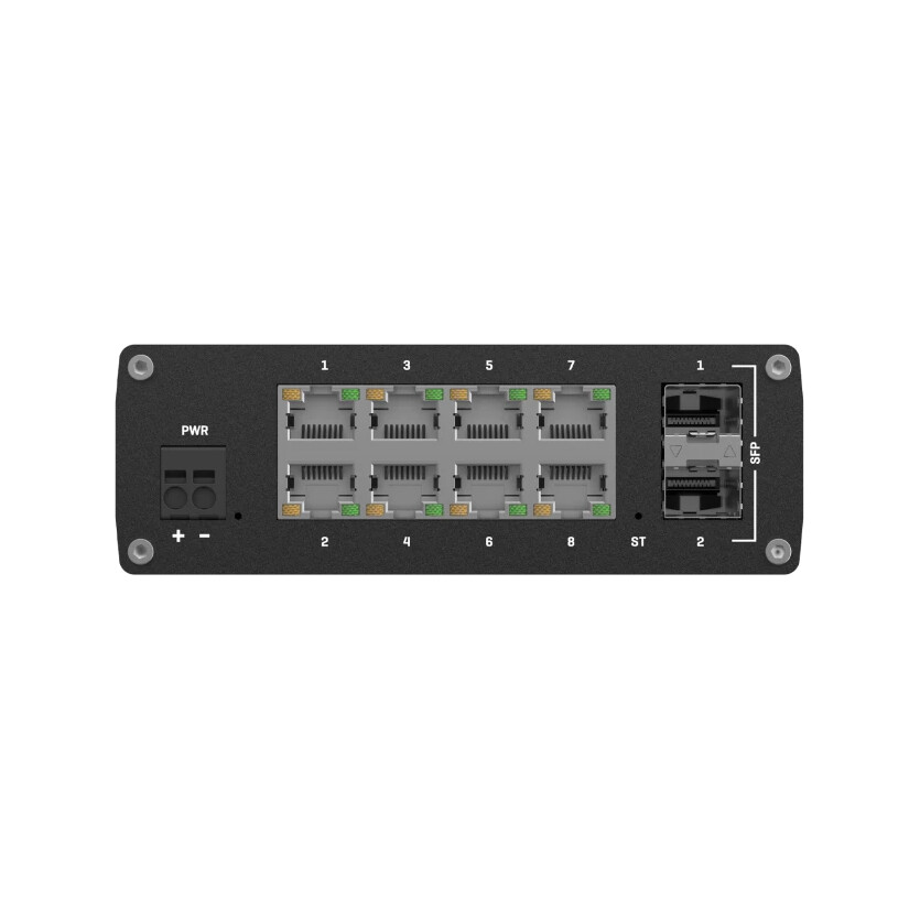 Switch industriale gestito Layer 2 con funzionalità L3 opzionali, dotato di 8 porte Gigabit Ethernet e 2 porte SFP per fibra. Supporta protocolli industriali come Profinet (classe B), EtherNet/IP e MRP ed è gestibile tramite interfaccia TSWOS e Teltonika RMS. Custodia in alluminio, montaggio DIN rail, perfetto per reti complesse in ambienti gravosi.