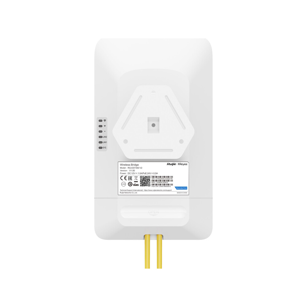 p>Il Ruijie Reyee RG-EST350 V2, parte della Serie EST, è un bridge wireless 802.11ac a 5 GHz progettato per connessioni punto-punto fino a 5 km. Supporta tecnologia 2x2 MIMO e velocità fino a 867 Mbps, garantendo una trasmissione stabile e ad alte prestazioni.La confezione comprende due dispositivi già preconfigurati e abbinati, pronti per installazioni plug-and-play. L'antenna direzionale da 14 dBi con polarizzazione orizzontale e verticale assicura stabilità di connessione. Con protezione IP54, resistenza antifulmine e gestione centralizzata tramite Ruijie Cloud, rappresenta una soluzione affidabile per collegare telecamere IP e dispositivi remoti in scenari esterni complessi.