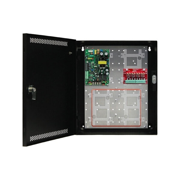 Il dispositivo include un cabinet in acciaio verniciato con piastra posteriore removibile e preforata, supporti per controller, viti di montaggio, serratura e due chiavi. Sono presenti quattro uscite CL2PL Classe 2 a potenza limitata, che forniscono alimentazione regolata e separata per ciascuna scheda Mercury e per il controllo delle serrature.