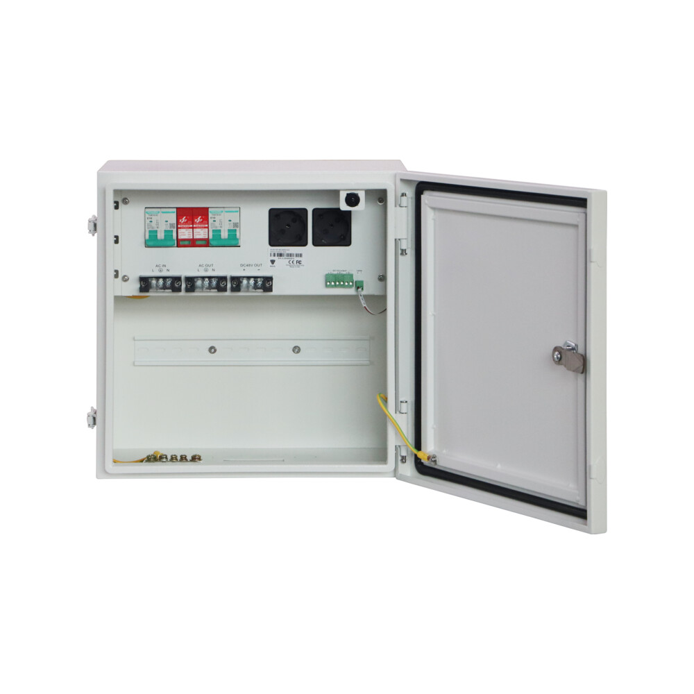 Il box di derivazione BOS offre alimentazione 230 Vac con uscite 12 V, 48 V e 230 Vac, integrando protezioni dedicate e una barra DIN per l'installazione di switch terze parti. Garantisce ordine e sicurezza grazie al grado IP53, alla ventilazione e alla luce interna attivata dal tamper porta.
