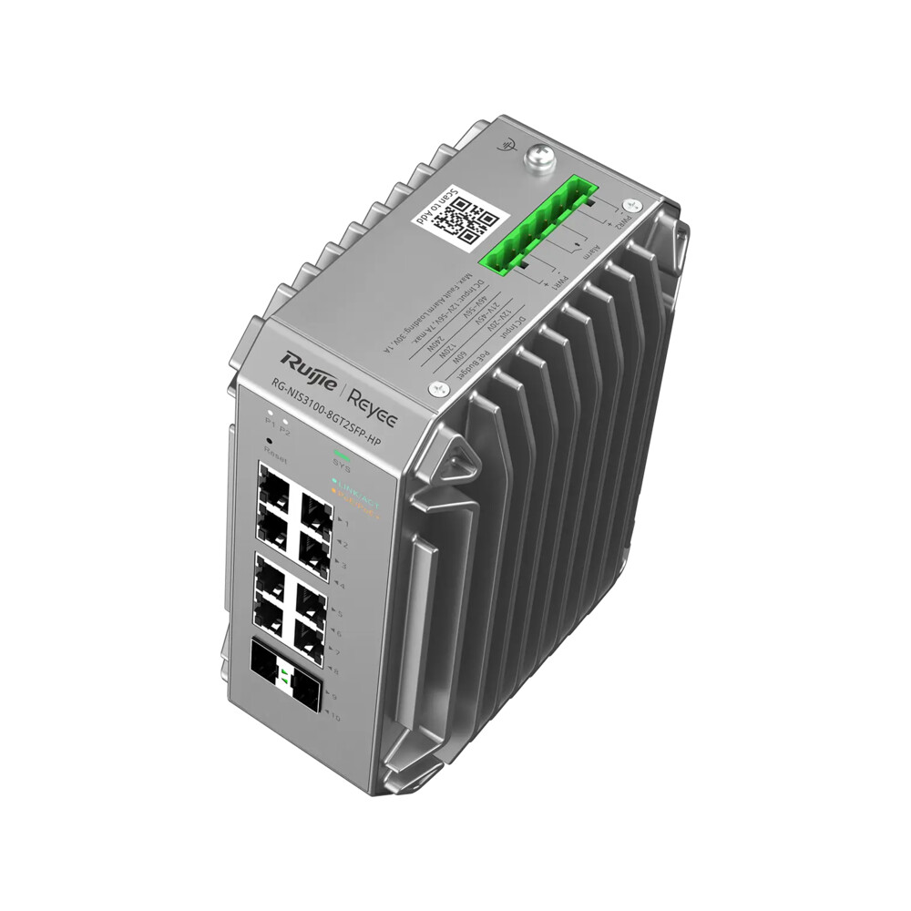 Lo switch industriale Layer 2 Ruijie Reyee RG-NIS3100-8GT2SFP-HP con 8 porte 10/100/1000BASE-T PoE+ e 2 uplink SFP da 1 Gbps è progettato per scenari industriali e aziendali che richiedono alimentazione diretta a dispositivi di rete come telecamere IP, access point Wi-Fi e telefoni VoIP.
