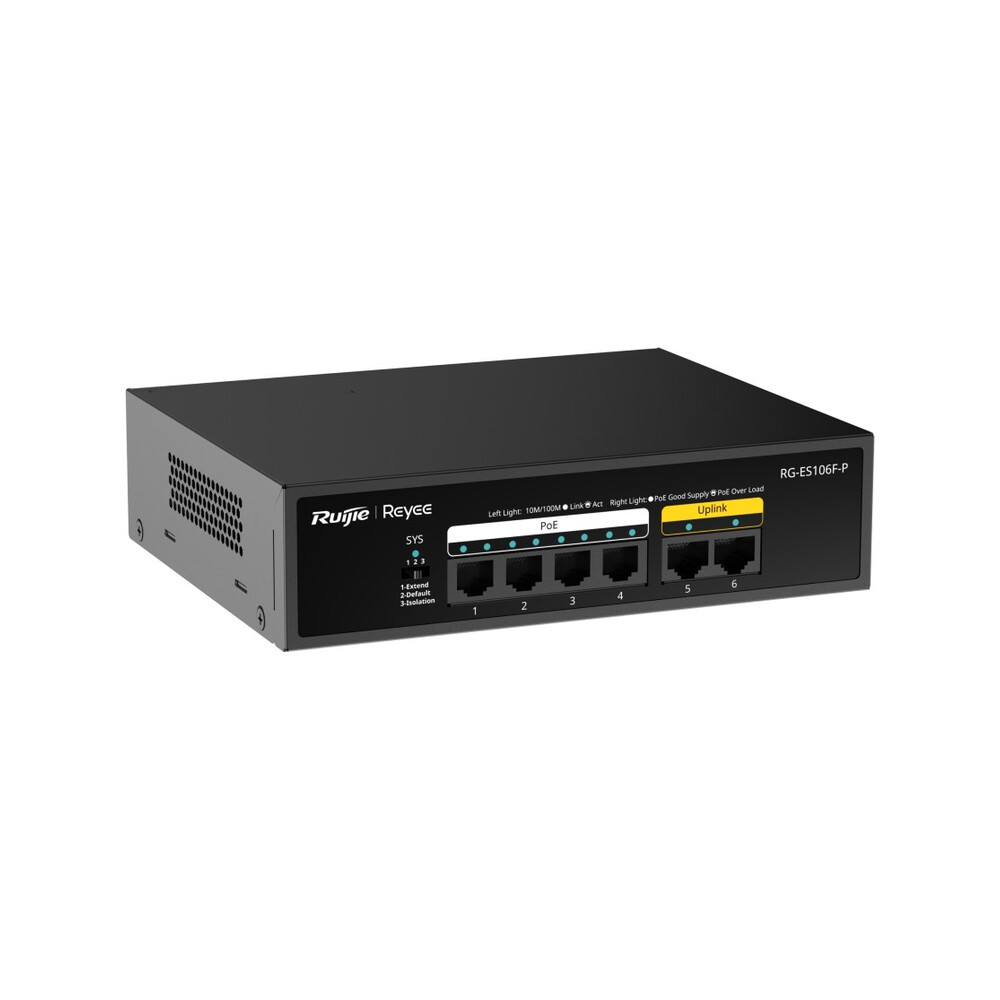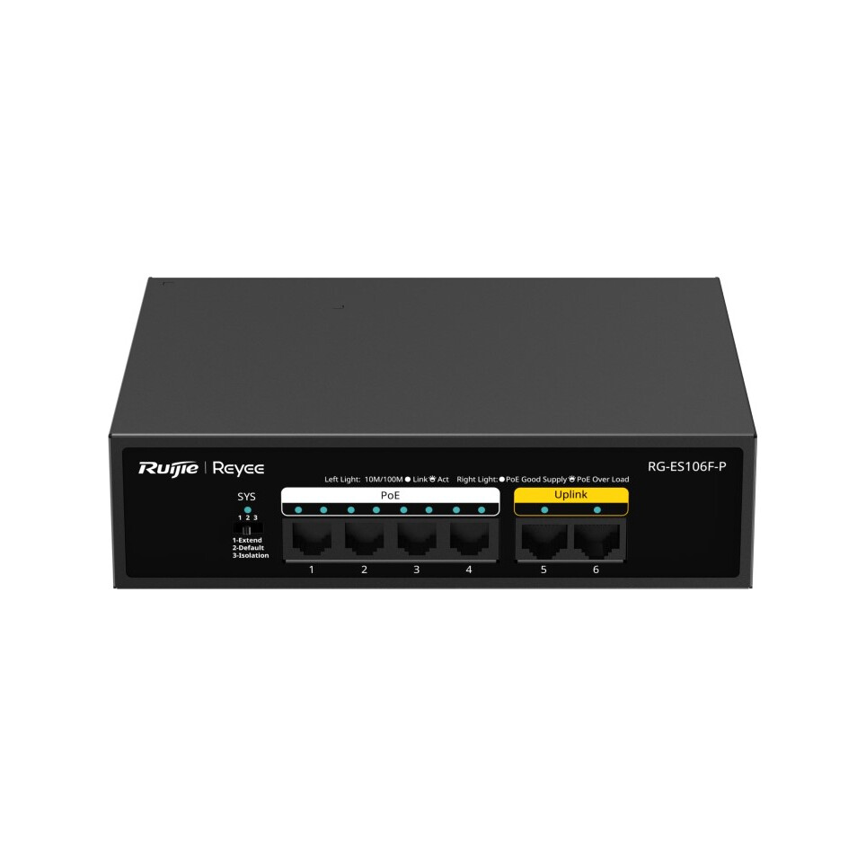 Il Ruijie Reyee RG-ES106F-P è uno switch non gestito con 6 porte 100 M, di cui 4 con supporto PoE. Ideale per piccoli uffici e sistemi di videosorveglianza, offre installazione plug-and-play e alimentazione diretta di dispositivi compatibili.