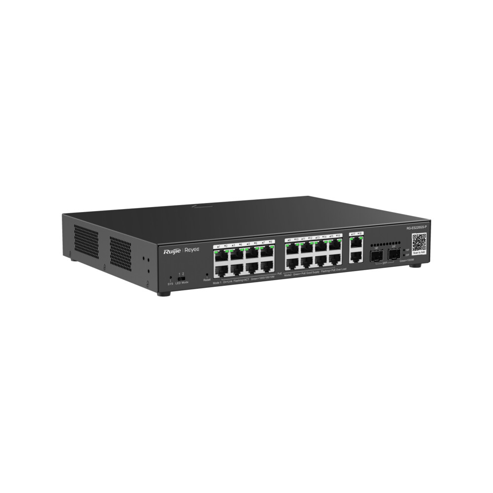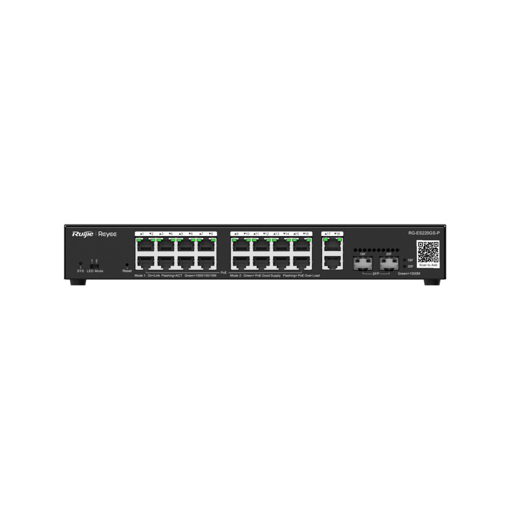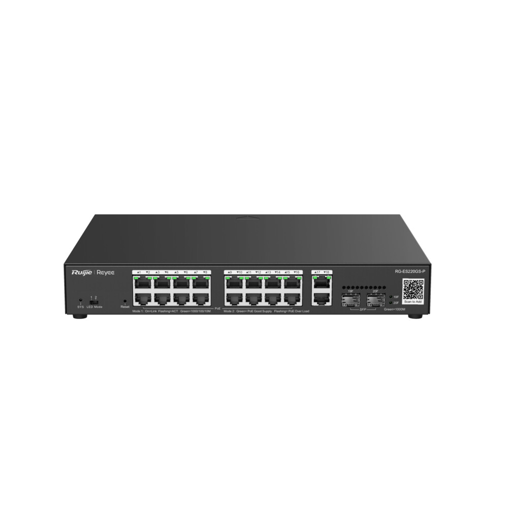 Il Ruijie Reyee RG-ES220GS-P è uno switch smart cloud ad alte prestazioni pensato per reti aziendali e applicazioni TVCC. Dispone di 20 porte Gigabit Ethernet 10/100/1000 Mbps, di cui 16 supportano PoE+ (802.3at/af), permettendo di alimentare direttamente access point, telecamere IP e telefoni VoIP.