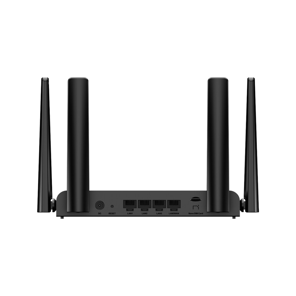 Il dispositivo integra quattro antenne esterne ad alto guadagno, uno slot Nano SIM e 4 porte Fast Ethernet (1 WAN/LAN e 3 LAN). Supporta fino a 8 utenti consigliati e offre sicurezza avanzata con WPA1/WPA2/WPA3. L'alimentazione è fornita tramite DC 12V/1.0A, mentre il design compatto (175 - 100 - 25 mm) lo rende adatto a diverse installazioni. La garanzia è di 3 anni.