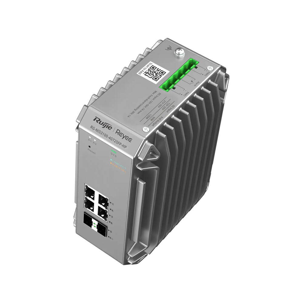 Lo switch industriale Layer 2 Ruijie Reyee RG-NIS3100-4GT2SFP-HP con 4 porte 10/100/1000BASE-T PoE+ e 2 uplink SFP da 1 Gbps è progettato per garantire stabilità , sicurezza e alimentazione diretta ai dispositivi di rete come telecamere IP, access point e telefoni VoIP.