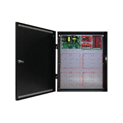 All’interno del cabinet metallico verniciato sono integrati un alimentatore da 150 W con caricabatterie, una piastra preforata per montaggio controller e 8 uscite CL2PL indipendenti per schede Mercury, oltre a 8 uscite fuse per relè di blocco. Include relè di guasto di tipo “C”, ingresso per allarme antincendio e interfaccia di rete opzionale per monitoraggio remoto tramite Access Control Manager.