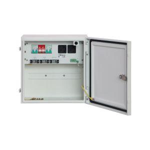 L'armadio metallico antisabotaggio con grado di protezione IP66 è resistente a polvere, acqua e urti, con chiusura a chiave e ventola di estrazione per il raffreddamento attivo. Il box integra 3 uscite a 12 Vcc da 1 A, 2 prese di servizio Schuko 230 Vac e luce di cortesia attivata dall'apertura porta. è predisposto per il collegamento a terra, dispone di pressacavi impermeabili PG7 e M25 ed è disponibile con accessori opzionali per montaggio a muro o a palo.