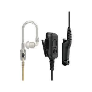 La configurazione a due fili prevede un cavo dedicato alla ricezione audio e un secondo filo che integra microfono, pulsante programmabile e comando Push To Talk. L'archetto trasparente contribuisce a ridurre la visibilità dell'accessorio, rendendolo adatto a impieghi professionali dove la discrezione è fondamentale.