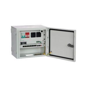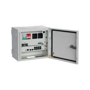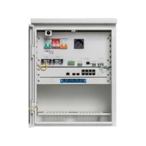L'armadio metallico antisabotaggio con grado di protezione IP66 è resistente a polvere, acqua e urti, con chiusura a chiave e ventola di estrazione per il raffreddamento attivo. Il box integra 3 uscite a 12 Vcc da 1 A, 2 prese di servizio Schuko 230 Vac e luce di cortesia attivata dall'apertura porta. è predisposto per il collegamento a terra, dispone di pressacavi impermeabili PG7 e M25 ed è disponibile con accessori opzionali per montaggio a muro o a palo.