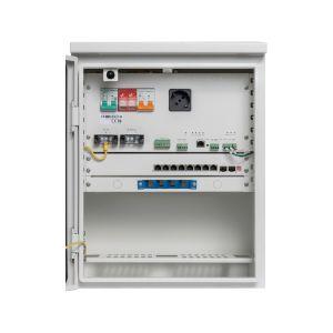 Dotata di uno switch PoE a 8 porte 10/100Base-TX con una potenza massima di 120W (30W per porta) e 2 porte SFP 10/100/1000Mbps, consente la connessione di dispositivi come telecamere e ponti radio. Il sistema include un cassetto ottico con 4 bussole LC per la gestione della fibra ottica.
